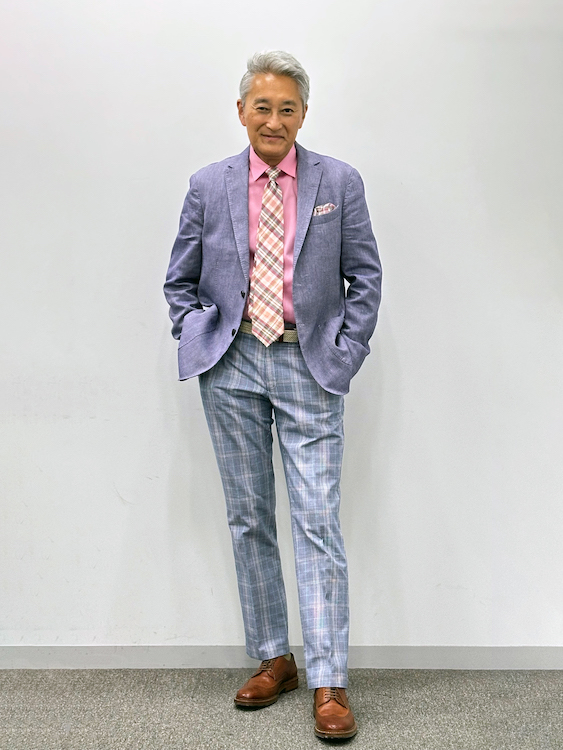 バーズアイ柄の綿麻ジャケットにコーラルピンクのシャツ、