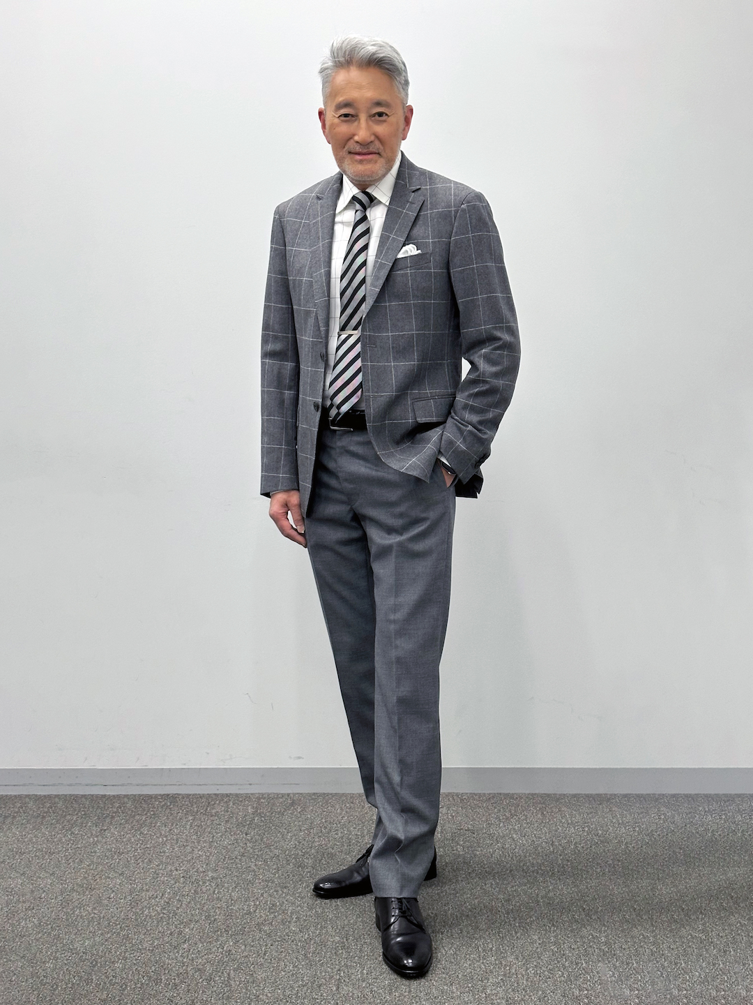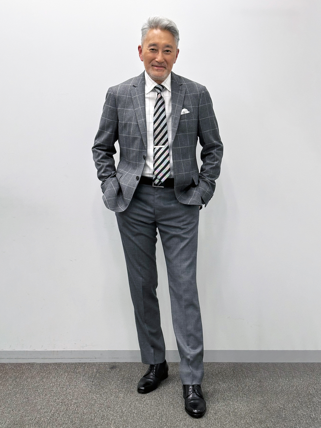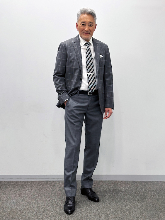 クラシックなウインドーペーンのジャケットをベースに、